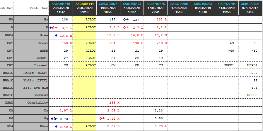 | Anion gap | 17 H | 16 | 15 | 16 | 12 | 16 | 23 H |