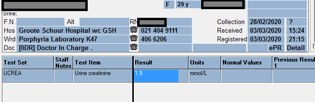 My thoughts initially, was that the urine amino acid screening by GCMS demonstrated a heavy generalized aminoaciduria indicative of renal tubulopathy and that cystinosis should be considered as this is the most common inheritable cause of renal tubulopathy in South Africa. However, this was later decided to be changed to rather and “evolving tubulopathy” clinical picture, as shown in the two examples below.